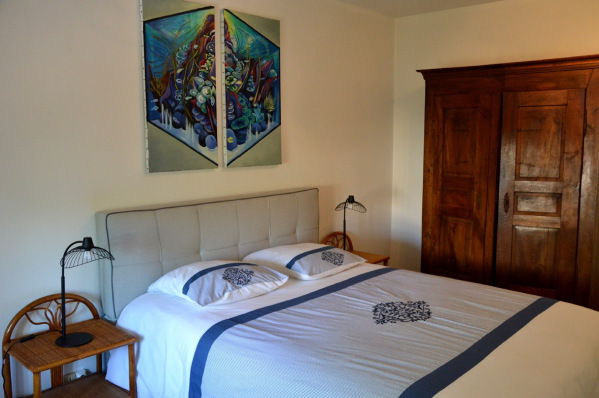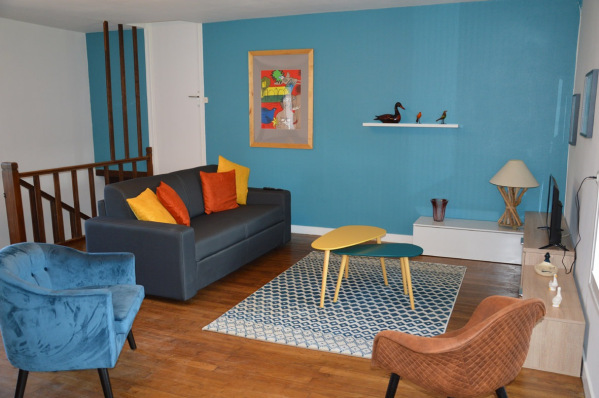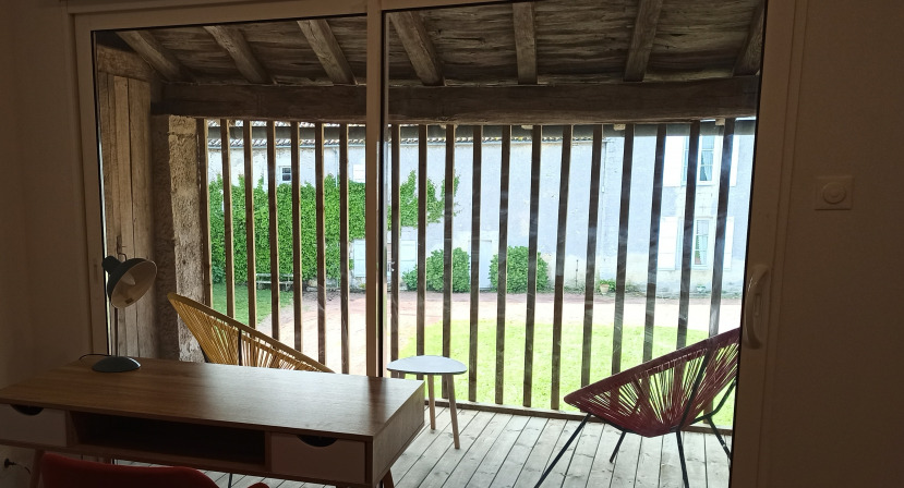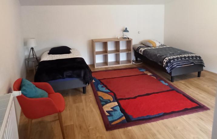 Cet appartement se trouve dans une dépendance du logis. Après avoir monté quelques marches, vous accédez directement au salon puis aux deux chambres. La première chambre comporte un lit double et la deuxième plus grande deux lits simples. Un lit canapé dans le salon complète l'offre de couchage supplémentaire.